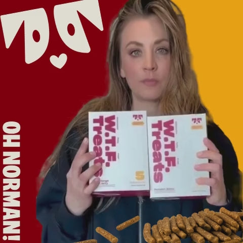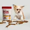 W.T.F. Dog Treats package labelled with 5 ingredients, in front of Free Range Beef Sticks, and with a veterinary specialist certification badge