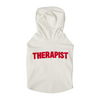 White hoodie with 'THERAPIST' in red and a comparison chart listing natural materials, ethical sourcing, sustainable packaging, cozy material, and pet support versus synthetic, unethical, wasteful, scratchy, and non-philanthropic alternatives.